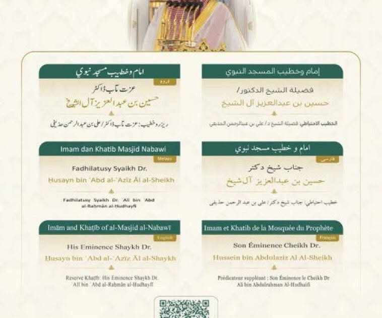 فيما يخطب ويؤم المصلين في المسجد النبوي فضيلة الشيخ الدكتور حسين بن عبدالعزيز آل الشيخ