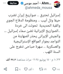 وأضاف: «الصواريخ الإيرانية تضئ سماء إسرائيل… والجيش الإيرانى يحذر الصهاينة من التواجد بجوار المواقع الاستراتيجية والعسكرية… سهرة صباحى نتفرج على ألسنة اللهب».