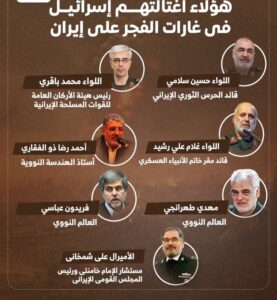 نجحت إسرائيل في اغتيال 7 شخصيات قيادية عسكرية وعلمية في إيران في عملياتها الجوية المتتالية فجر اليوم الجمعة التي أطلقوا عليها عملية قوة الأسد