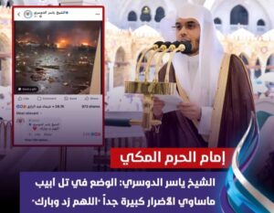 غرد إمام الحرم المكي الشيخ ياسر الدوسري مرفقا منشوره بصورة تبين حجم الدمار الذي خلفته الضربات الإيرانية بالصواريخ الباليستية في تل أبيب واصفا الوضع الآن بالكيان المحتل بالمأساوي وأن الأضرار في إسرائيل كبيرة جدا جراء الضربات الإيرانية  ليعلق بعدها على وضع تل أبيب المأساوي قائلا :