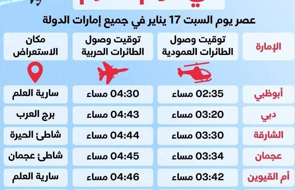 تنظم القوات المسلحة الإماراتية وفريق “فرسان الإمارات للاستعراضات الجوية”، عروضاً جوية مبهرة عصر يوم السبت 17 يناير في مختلف إمارات الدولة.
