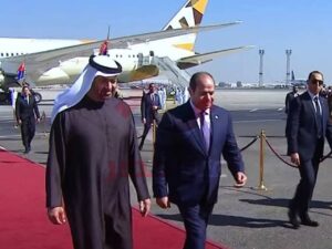 وصرّح المتحدث الرسمي باسم رئاسة الجمهورية بأن اللقاء شمل اجتماعاً موسعاً ضم وفدي البلدين، أعقبه اجتماع ثنائي مغلق بين الزعيمين، ثم مأدبة غداء عمل أقيمت تكريماً لضيف مصر الكبير والوفد المرافق لسموه. وقد استهل السيد الرئيس اللقاء بالتأكيد على عمق ومتانة العلاقات الثنائية بين مصر ودولة الإمارات، مشيداً بالتطور الملحوظ في التعاون بين البلدين في مختلف المجالات، لا سيما في مجالي التجارة والاستثمار. كما أعرب سيادته عن حرص الدولة المصرية على تذليل كافة العقبات أمام الاستثمارات الإماراتية، مثمناً الطفرة التي تشهدها العلاقات الاقتصادية بين الجانبين. من جانبه، أشاد صاحب السمو الشيخ محمد بن زايد آل نهيان بما يشهده مناخ الاستثمار في مصر من تطور كبير، يعكس الجهود المبذولة لتعزيز بيئة الأعمال وجذب الاستثمارات.