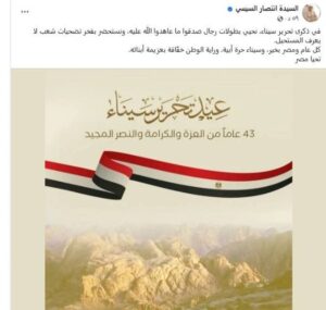 وكتبت انتصار السيسي عبر صفحتها الرسمية: “في ذكرى تحرير سيناء، نحيي بطولات رجال صدقوا ما عاهدوا الله عليه، ونستحضر بفخر تضحيات شعب لا يعرف المستحيل”.