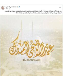 واختتمت قرينة الرئيس تهنئتها بالدعاء: “تقبل الله منّا ومنكم صالح الأعمال، وجعل أيامكم عامرة بالفرح، وأعيادكم دائماً مطمئنة وآمنة