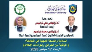 تحت رعاية الأستاذ الدكتور إلهامي ترابيس رئيس جامعة دمنهور ، الأستاذ الدكتور إيناس محمد ابراهيم نائب رئيس الجامعة لشؤون خدمة المجتمع وتنمية البيئة نظم قطاع خدمة المجتمع وتنمية البيئة ورشة عمل بعنوان السلامة والصحة المهنية في الجامعة ” الوقاية من الحرائق وإجراءات الإخلاء”، حاضرفيها الدكتور عمرو الدمرداش عضو هيئة التدريس بكلية الفنون التطبيقية ومدير وحدة الطبع والنسخ بالجامعة، بحضور مايقرب من 25 إداري، وذلك بمركز تنمية قدرات أعضاء هيئة التدريس والقيادات بالجامعة.