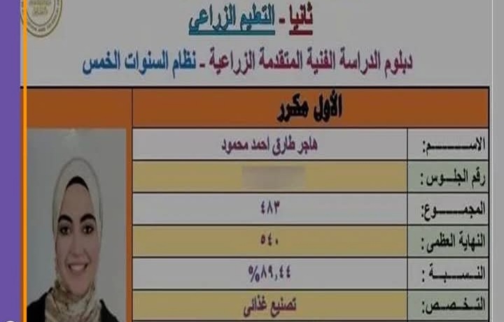 رحاب أحمد كامل فهي بمحمود 445 درجة بـ90% من الجيزة