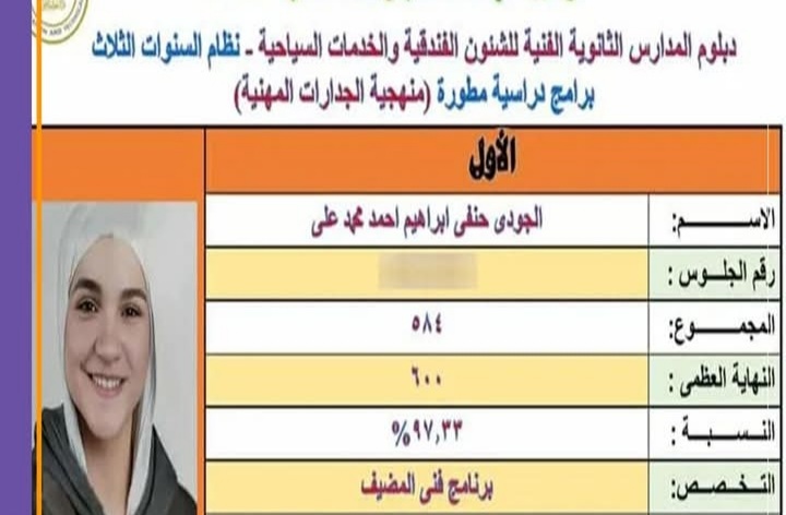ندا صابر فؤاد محمد بمجموع 417 درجة بنسبة 96% من السويس