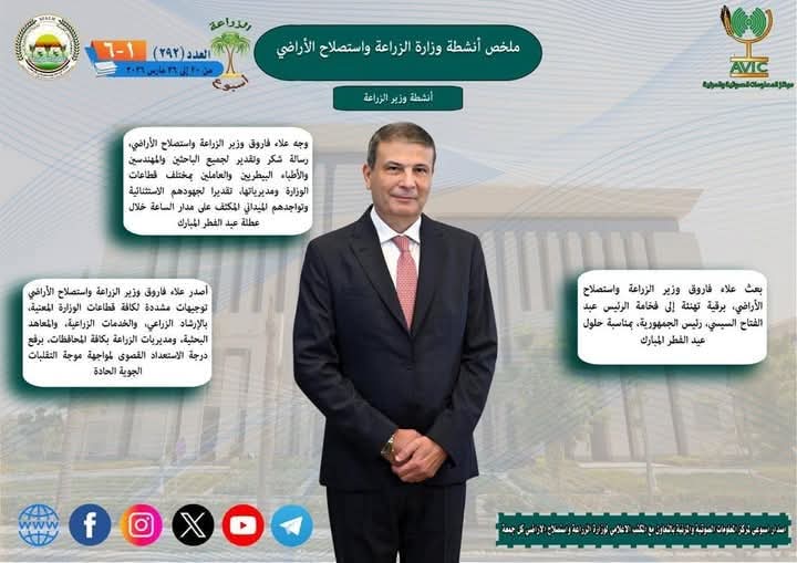 يذكر ان مركز المعلومات الصوتية والمرئية، والمكتب الاعلامي للوزارة، يصدران الجمعة من كل اسبوع، انفوجرافا وفيديو باسم: الزراعة في اسبوع، لالقاء الضوء على ملخص ما تم من انشطة وجهود، بكافة القطاعات والهيئات، التابعة للوزارة.
