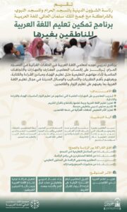 أقامت رئاسة الشؤون الدينية بالمسجد الحرام والمسجد النبوي بالشراكة مع مجمع الملك سلمان العالمي للغة العربية برنامجًا متخصصًا لتمكين تعليم اللغة العربية لغير الناطقين بها داخل الحرمين الشريفين