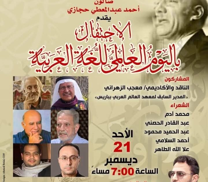 ينظم بيت الشعر العربي التابع لـ صندوق التنمية الثقافية، في السابعة من مساء الأحد القادم 21 ديسمبر، صالون الشاعر أحمد عبد المعطي حجازي، احتفاءً بـ اليوم العالمي للغة العربية، وذلك بمقر بيت الشعر (مركز إبداع الست وسيلة) خلف الجامع الأزهر.