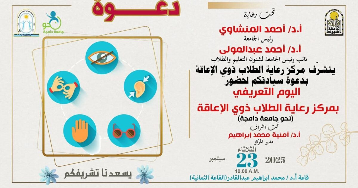 تعلن الجامعة تحت رعاية الدكتور أحمد المنشاوي، رئيس جامعة أسيوط، عن تنظيم يوم تعريفي بمركز رعاية الطلاب ذوي الإعاقة تحت شعار “نحو جامعة دامجة”، وذلك تزامناً مع الاحتفال باليوم العالمي للغة الإشارة، يوم الثلاثاء الموافق 23 سبتمبر، في تمام الساعة العاشرة صباحاً، بقاعة الأستاذ الدكتور محمد إبراهيم عبد القادر (القاعة الثامنة). تحت إشراف الدكتور أحمد عبد المولى، نائب رئيس الجامعة لشئون التعليم والطلاب، والدكتورة أمنية محمد إبراهيم، مدير المركز.