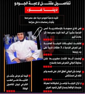 قُتلت لاعبة الجودو بنادي سموحة في الإسكندرية، دينا علاء، بعدما أصيبت بثلاث رصاصات أطلقها زوجها عقب محاولتها إنقاذ طفليها من اعتدائه.