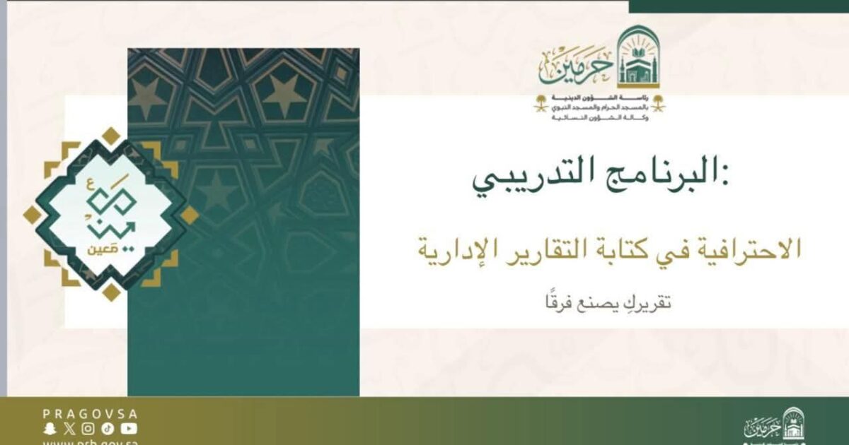 تقيم وكالة الشؤون الإثرائية والتطوعية النسائية بالمسجد الحرام دورةً تدريبيةً بعنوان: «الاحترافية في كتابة التقارير الإدارية»؛ وذلك بهدف تطوير مهارات موظفات رئاسة الشؤون الدينية في إعداد التقارير المهنية وفق أفضل الممارسات الحديثة.