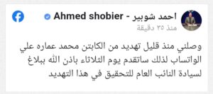 وكتب شوبير عبر حسابه الرسمي على موقع «فيسبوك»: «وصلني منذ قليل تهديد من الكابتن محمد عمارة على الواتساب لذلك سأتقدم يوم الثلاثاء بإذن الله ببلاغ لسيادة النائب العام للتحقيق في هذا التهديد»