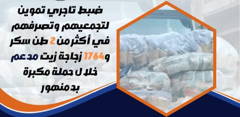 ضبط تاجري تموين لتجميعهما وتصرفهما في أكثر من ٢ طن سكر و١٧٦٤ زجاجة زيت مدعم خلال حملة مكبرة بدمنهور