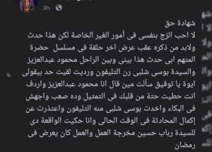 وقال عبدالحميد في منشوره الذي عنونه بشهادة حق : «لا أحب الزج بنفسي في أمور الغير الخاصة، لكن هذا حدث ولا بد من ذكره…»، موضحًا أن الراحل محمود عبدالعزيز اتصل به شخصيًا وقال بتأثر شديد: «إنت حطيت حتة من قلبك في التمثيل، وده صعب»، ثم دخل في نوبة بكاء.