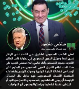 وقال منصور عبر حسابه الرسمي بموقع التواصل الاجتماعي فيس بوك إنه “يهنئ الشعب السعودي الشقيق على انتصار نادي الهلال زعيم آسيا وممثل الدوري السعودي في بطولة كأس العالم للأندية، وفوزه المستحق وبجدارة وبأداء عالمي على الفريق الانجليزي مانشستر سيتي، وهو الانتصار الذي أسعد كل عربي قلبه صافي من الغل والأحقاد” .