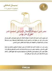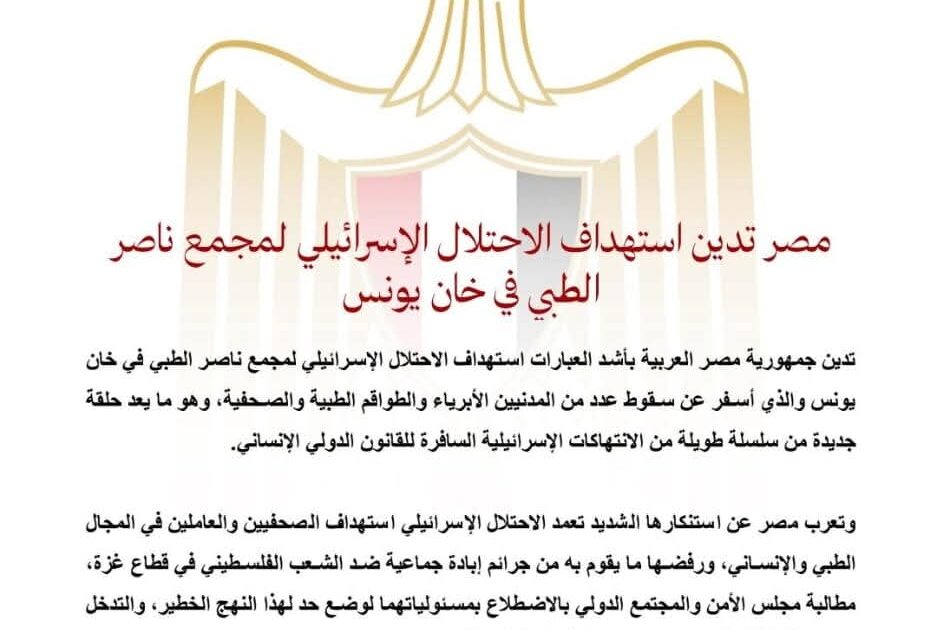 تدين جمهورية مصر العربية بأشد العبارات استهداف الاحتلال الإسرائيلي لمجمع ناصر الطبي في خان يونس والذي أسفر عن سقوط عدد من المدنيين الأبرياء والطواقم الطبية والصحفية، وهو ما يعد حلقة جديدة من سلسلة طويلة من الانتهاكات الإسرائيلية السافرة للقانون الدولي الإنساني.