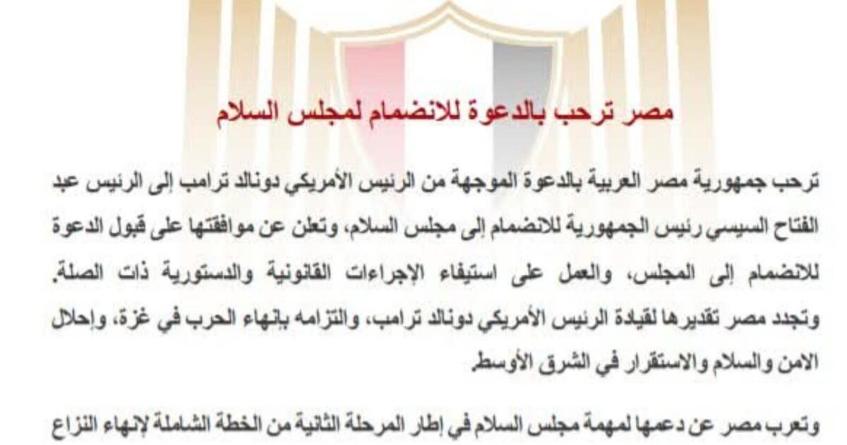 ※رحبت جمهورية مصر العربية اليوم /الأربعاء/ بالدعوة الموجهة من الرئيس الأمريكي دونالد ترامب إلى الرئيس عبدالفتاح السيسي للانضمام إلى مجلس السلام، وأعلنت عن موافقتها على قبول الدعوة للانضمام إلى المجلس، والعمل على استيفاء الإجراءات القانونية والدستورية ذات الصلة.