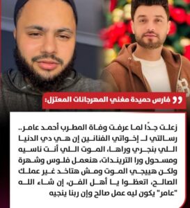 قال فارس حميدة مطرب المهرجانات المعتزل بعد تلقي خبر وفاة المطرب الشاب أحمد عامر صباح اليوم في تدوينة خاصة :