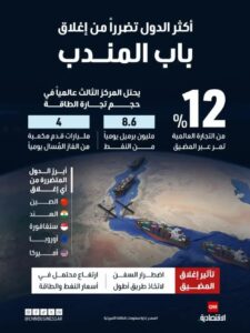 أ. تأثيرات فورية على أسواق الطاقة: حيث سيؤدي إغلاق باب المندب إلى منع وصول ناقلات النفط من الخليج العربي إلى قناة السويس، مما يعني عملياً عزل أسواق أوروبا وأميركا الشمالية عن إمدادات النفط الخليجية. تشير التقديرات إلى أن أسعار النفط قد تقفز بنسبة 30 إلى 50% خلال أيام من الإغلاق؛