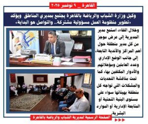 جاء ذلك خلال الاجتماع الموسع الذي عقده فوزي مع مديري مناطق الشباب والرياضة بالقاهرة، تنفيذًا لتوجيهات الأستاذ الدكتور أشرف صبحي وزير الشباب والرياضة، والأستاذ الدكتور إبراهيم صابر محافظ القاهرة، بشأن الارتقاء بالخدمات المقدمة للمواطنين ودعم بيئة العمل داخل المديريات.