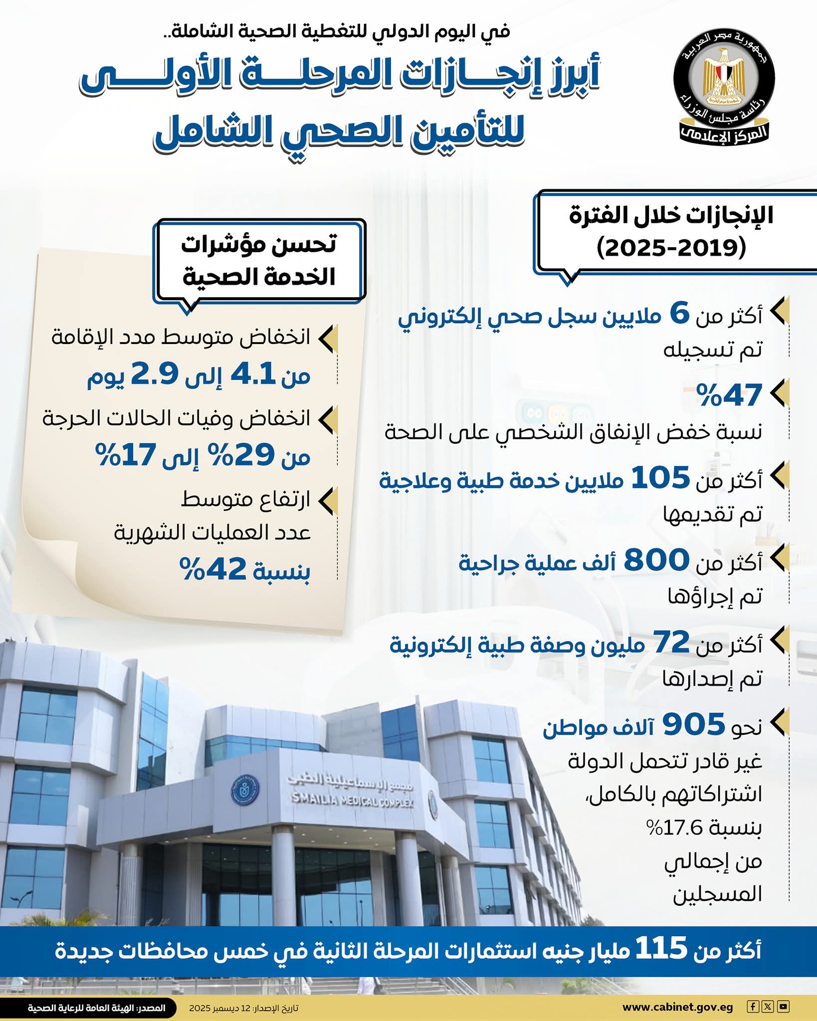 متابعة القراءةمنظومة التأمين الصحي الشامل إحداث تحول عبده الشربيني حمام تزامنًا مع اليوم الدولي للتغطية الصحية الشاملة، يواصل تطبيق منظومة التأمين الصحي الشامل إحداث تحول جذري في بنية النظام الصحي المصري منذ إطلاقها عام 2019، عبر تحسين جودة الخدمات وتعزيز كفاءة الإنفاق من خلال التحول الرقمي وتطوير البنية التحتية واعتماد أحدث