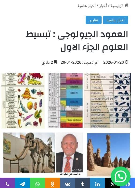 متابعة القراءةالعمود الجيولوجى.. تبسيط العلوم آلجزء الرابع إعداد د. أحمد على عطية الله • حقب الحياة الحديثة :- تعتبر آخر أحقاب التاريخ الجيولوجى , كما أنه أقصرها زمنا ً إذ لا يتعدى مداه الزمنى 65 مليون عاماً وخلالها أخذت الأرض هيئتها