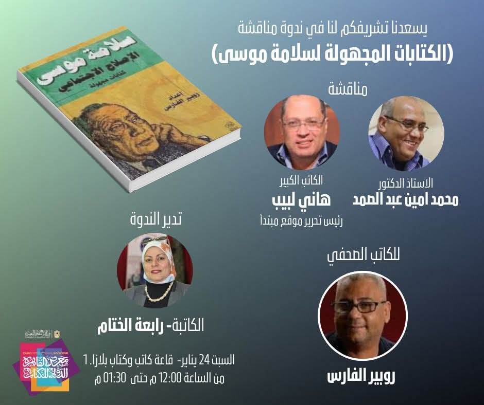 متابعة القراءةكتابات مجهولة لسلامة موسى في معرض الكتاب حامد خليفة تستضيف قاعة كاتب وكتاب بلازا ١ ضمن فعاليات معرض القاهرة الدولي للكتاب في دورته السابعة والخمسين ندوة الكاتب الصحفي والروائي روبير الفارس عن كتابات مجهولة لسلامة موسى وتناقش ثلاثة إصدارات جديدة لتوثيق المقالات المنشورة في عدة مجلات قديمة للكاتب التنويري