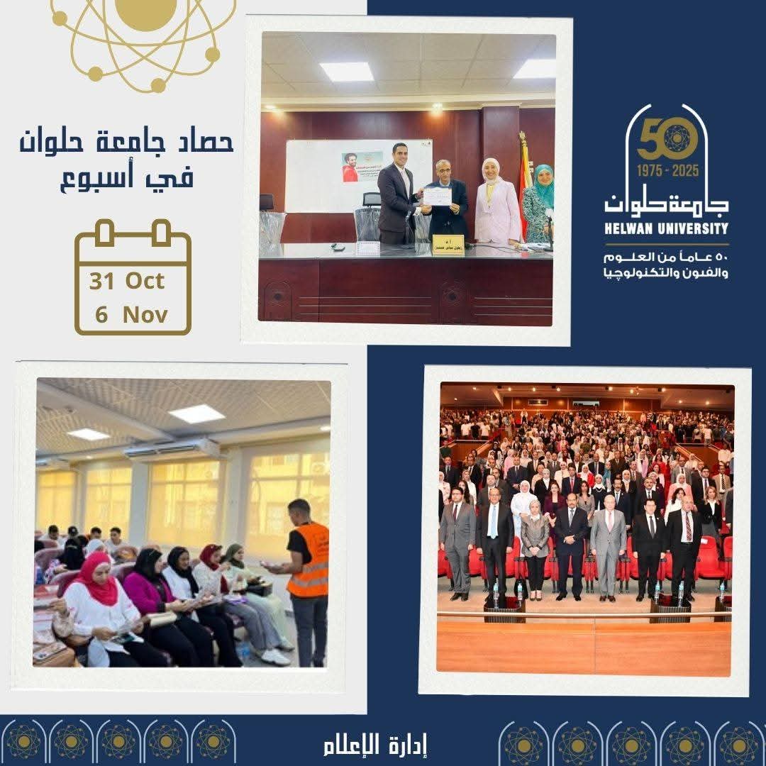 جامعة حلوان في أسبوع حافل بالتميز والإنجازات كتب : احمد سلامة تواصل جامعة حلوان تقديم فعالياتها وأنشطتها المتنوعة، مؤكدة دورها الريادي في دعم الإبداع والتميز الأكاديمي والمجتمعي. احتفالات وتكريمات - الدكتور السيد قنديل يهنئ الشعب المصري بافتتاح المتحف المصري الكبير، واصفًا إياه بمنارة حضارية ورسالة عالمية. - تهنئة للدكتور حسام