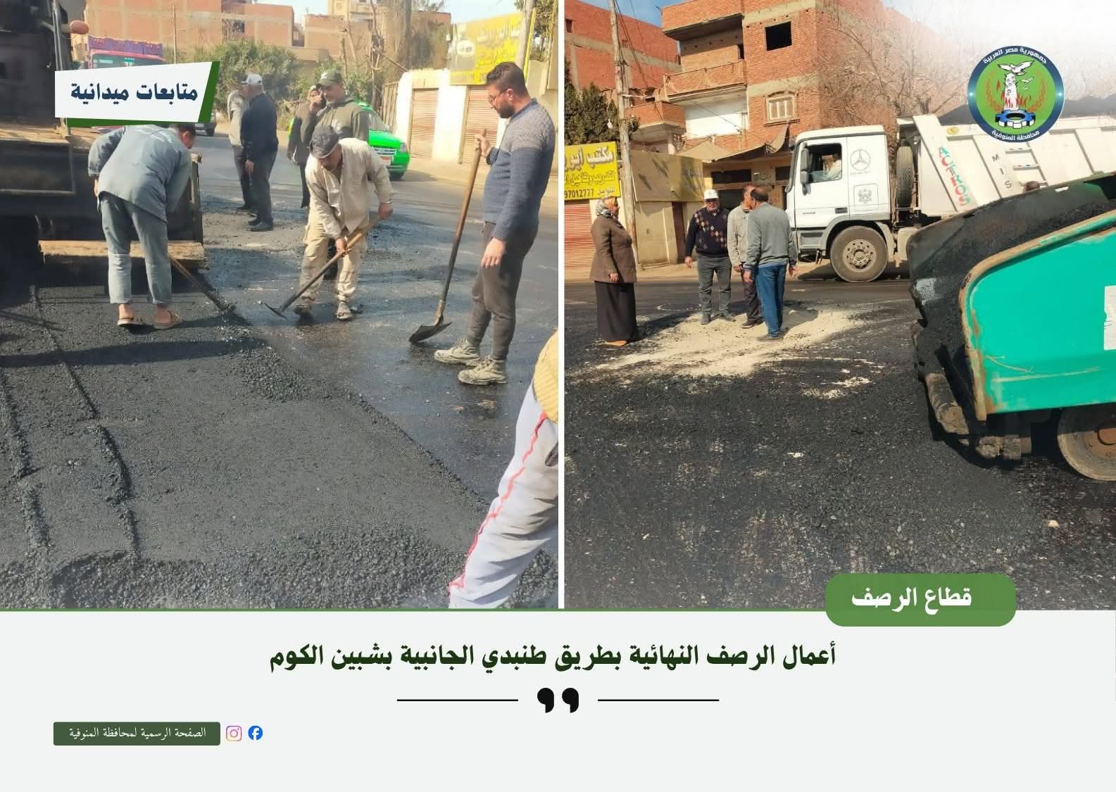 المنوفية تتغير على الأرض.. محافظ الإقليم يتابع أعمال الرصف والتطوير بعدة مراكز متابعة أشرف ماهر ضلع في إطار توجيهات اللواء إبراهيم أبو ليمون محافظ المنوفية، بالمتابعة المستمرة لمشروعات الخطة الاستثمارية للعام المالي الحالي، واصلت الأجهزة التنفيذية بالمحافظة متابعة أعمال الرصف والتطوير بعدد من مراكز الشهداء وأشمون وشبين الكوم، وذلك ضمن