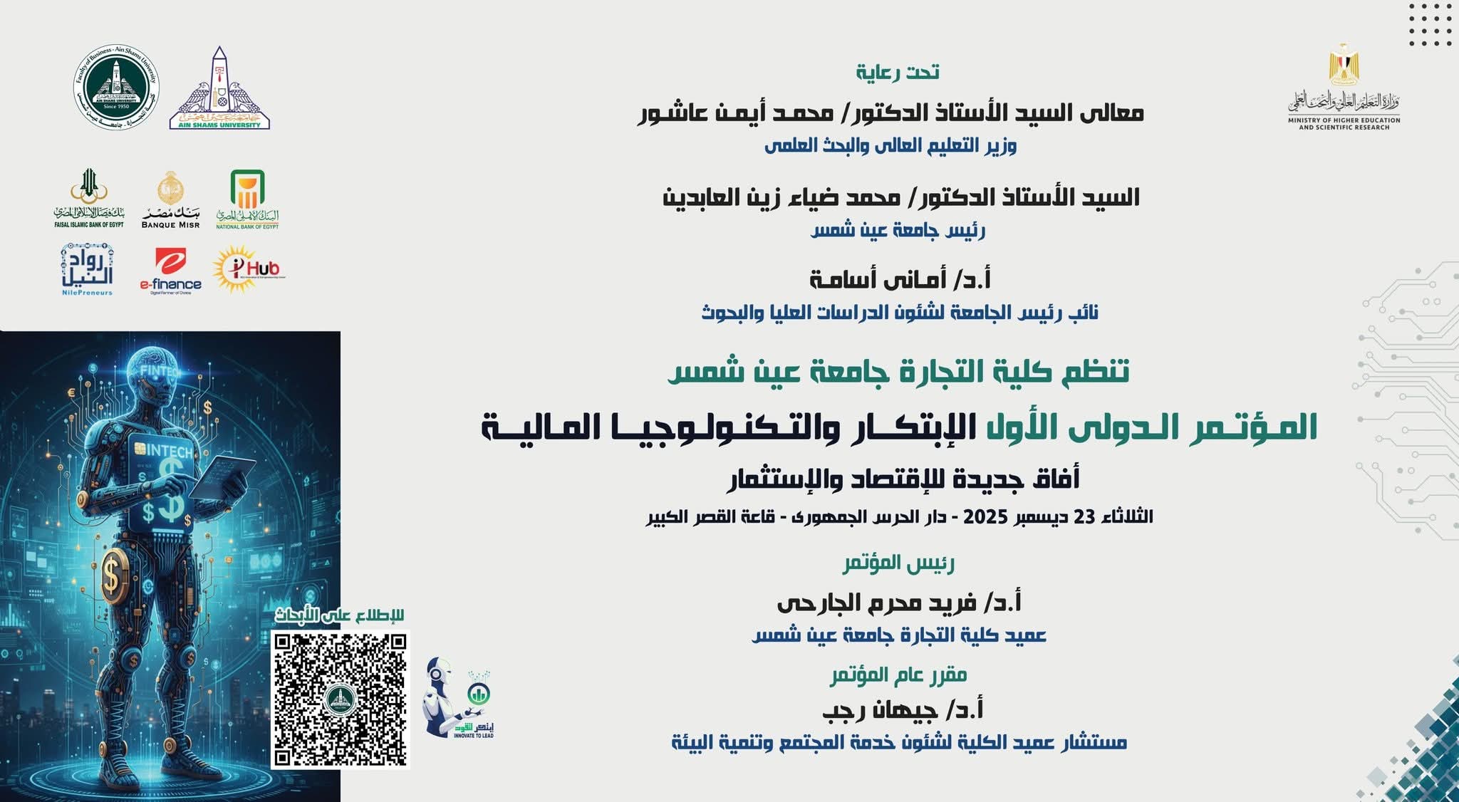 انطلاق المؤتمر الدولي الأول لتجارة عين شمس تحت عنوان: "الابتكار والتكنولوجيا المالية" كتب : احمد سلامة أعلنت كلية التجارة – جامعة عين شمس عن تنظيم المؤتمر الدولي الأول بعنوان: “الابتكار والتكنولوجيا المالية.. آفاق جديدة للاقتصاد والاستثمار”، والمقرر عقده يوم الثلاثاء الموافق 23 ديسمبر 2025 بقاعة القصر الكبير بدار الحرس الجمهوري،