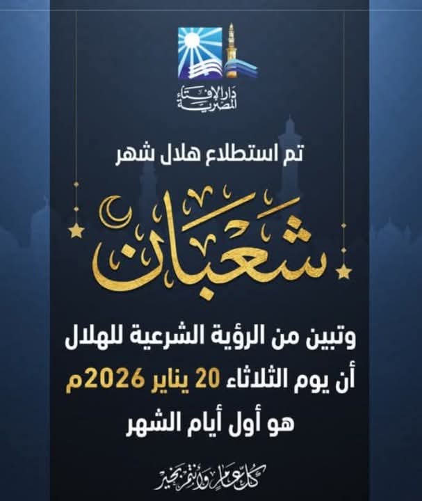 متابعة القراءةبيان دار الإفتاء المصرية حول رؤية هلال شهر شعبان لعام 1447هـ كتب - سمير احمد القط استطلعَت دارُ الإفتاءِ المصريةُ هلالَ شهرِ شعبان لعام ألفٍ وأربعمائةٍ وسبعة وأربعين هجريًّا بعد غروب شمس يوم الأحد التاسع والعشرين من شهر رجب لعام ألفٍ وأربعمائةٍ وسبعة وأربعين هجريًّا، الموافق الثامن عشر من شهر