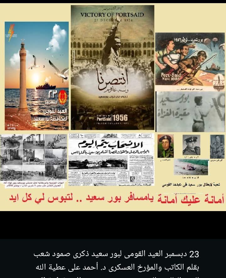 23 دبسمبر العيد القومى لبور سعيد ذكرى صمود شعب بقلم الكاتب والمؤرخ العسكرى د. أحمد على عطية الله اليوم الثالث والعشرون من ديسمبر هو الذكرى السنوبة على دحرالعدوان الثلاثى على مصر عام 1956من ثلاث قوى عدوانية بينهما القوتان العظميان فى العالم وهما إنجلترا وفرنسا وقوةإستعمارية ثالثة زرعها الأستعمار