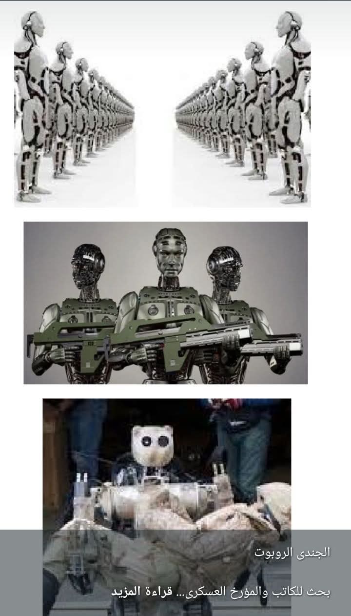 متابعة القراءةالجندى الروبوت للكاتب والمؤرخ العسكرى د. أحمد على عطية الله رويدا رويدا تتسلل الي الجيوش العالمية تقنية جديدة من وسائل القتال حتى يأتى يوما ليس بعيدا تكون فيه الصراعات بين الدول بالكامل بواسطة مقاتلين أليين وهو ما يطلق عليه العلماء الثورة الثالثة فى الحروب حيث كان الثورة الاولي باستخدام "البارود"
