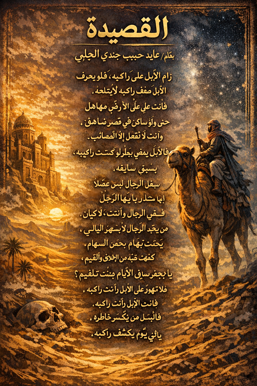 بواسطة عايد حبيب جندي الجبلي | أبريل 09, 2026 |3 دقائق قراءة | لا تعليقات : الإبل تمثل القوة أو المواقف الصعبة في الحياة، والراكب هو الإنسان الذي يحاول التحكم فيها. فإذا كان الإنسان ضعيفًا عقليًا أو غير حكيم، فإن القوة أو المسؤولية التي يحملها ستتغلب عليه.