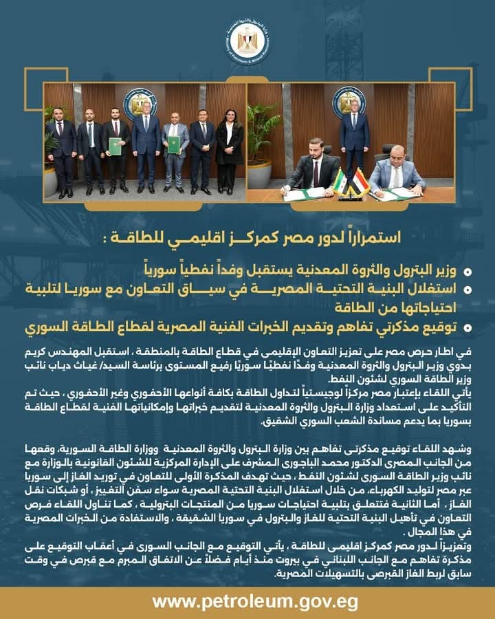 كتب - سمير احمد القط في إطار حرص مصر على تعزيز التعاون الإقليمى في قطاع الطاقة بالمنطقة، استقبل المهندس كريم بدوي وزير البترول والثروة المعدنية وفدًا نفطيًا سوريًا رفيع المستوى برئاسة السيد/ غياث دياب نائب وزير الطاقة السوري لشئون النفط. يأتي اللقاء بإعتبار مصر مركزًا لوجيستيًا لتداول