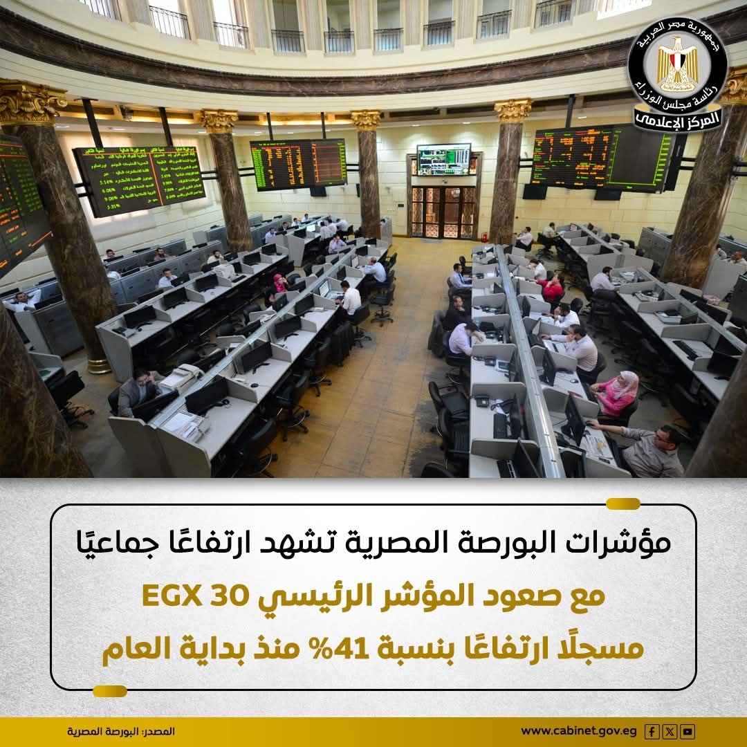 البورصة المصرية تشهد ارتفاعات جماعية عبده الشربيني حمام شهدت البورصة المصرية اليوم ارتفاعات جماعية مدفوعة بجهود تعزيز ودعم الأسواق، حيث تمكن المؤشر الرئيسي EGX 30 من اختراق حاجز 42 ألف نقطة لأول مرة في تاريخه. وأغلق المؤشر عند مستوى 41963.24 نقطة في إغلاق اليوم 8 ديسمبر 2025، مسجلًا مكاسب يومية