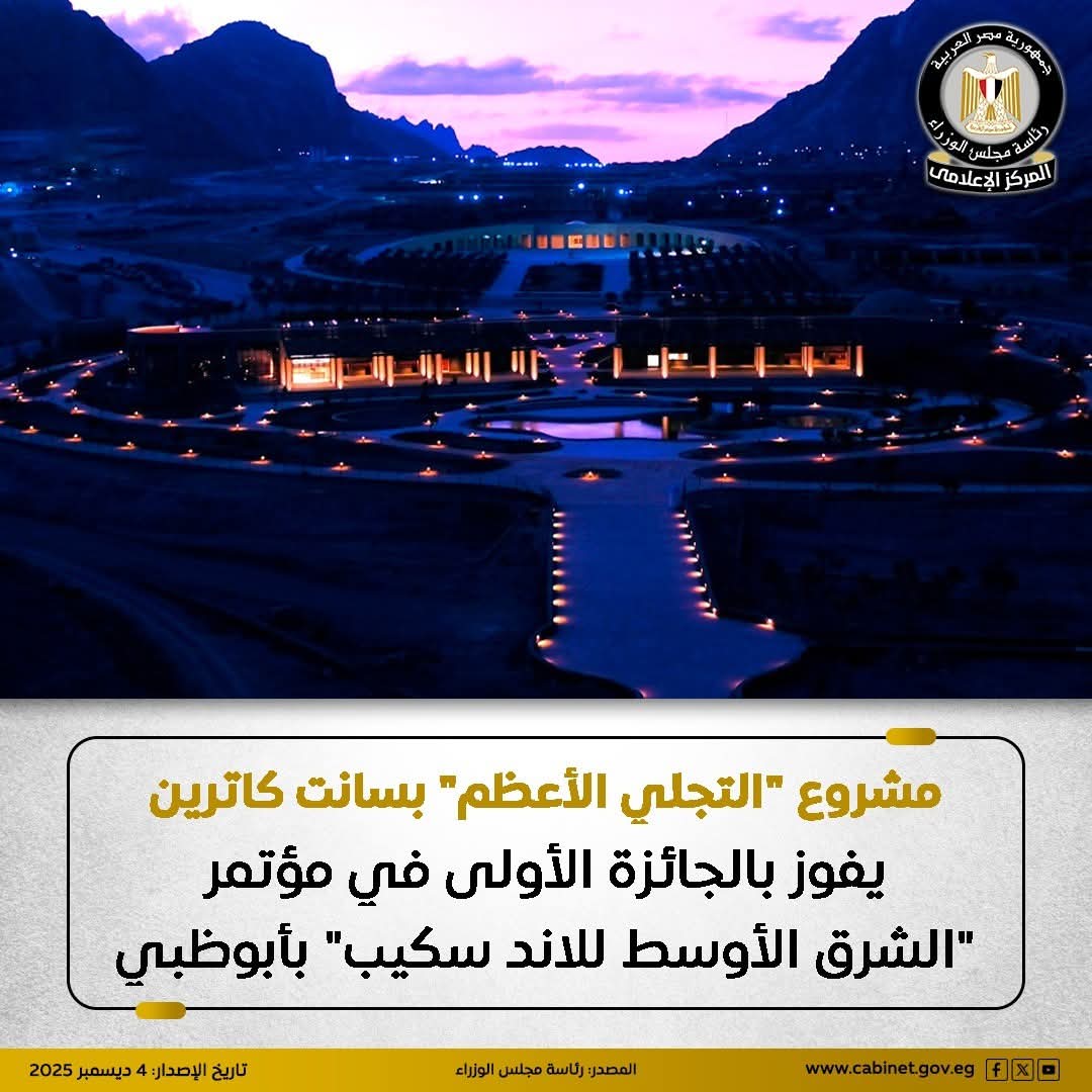 التجلي الأعظم" بمدينة سانت كاترين يفوز بالجائزة الأولى متابعة عبده الشربيني فاز مشروع "التجلي الأعظم" بمدينة سانت كاترين بالجائزة الأولى في مؤتمر ومعرض "الشرق الأوسط للاند سكيب ٢٠٢٥"، الذي عقد في مدينة أبوظبي بدولة الإمارات العربية المتحدة، تحت شعار "الطبيعة والمجتمع"، ويجسد هذا الشعار الإيمان بأن هندسة اللاندسكيب تتجاوز مجرد