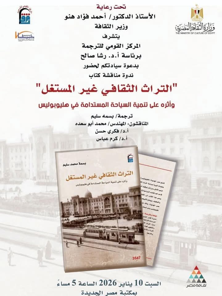 السبت القادم .. المركز القومي للترجمة يناقش “التراث الثقافي غير المستغل” بمقر مكتبة مصر الجديدة متابعة الكاتب سمير احمد القط يناقش المركز القومي للترجمة يوم السبت القادم “التراث الثقافي غير المستغل” بمقر مكتبة مصر الجديدة. يذكّر المركز القومي للترجمة برئاسة الأستاذة الدكتورة رشا صالح، بموعد ندوة مناقشة
