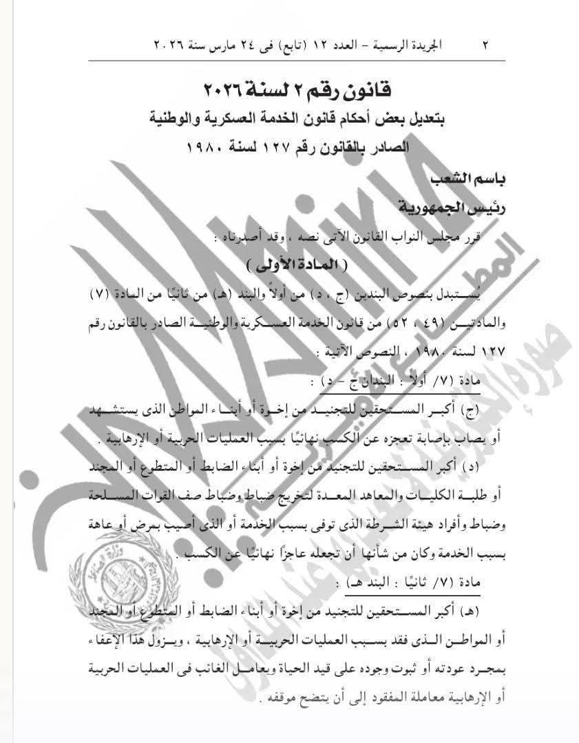 ​متابعة محمد عابدين الرعمي ​ نشرت الجريدة الرسمية القانون رقم 2 لعام 2026 بتعديل بعض أحكام الخدمة العسكرية والوطنية. شملت المادة 49 تغليظ عقوبة من يتخطى سن 30 دون إنهاء إجراءاته لتصل للحبس مدة لا تقل عن عام. ارتفعت الغرامة المالية لتبدأ من 20 ألف جنيه حتى 100 ألف أو