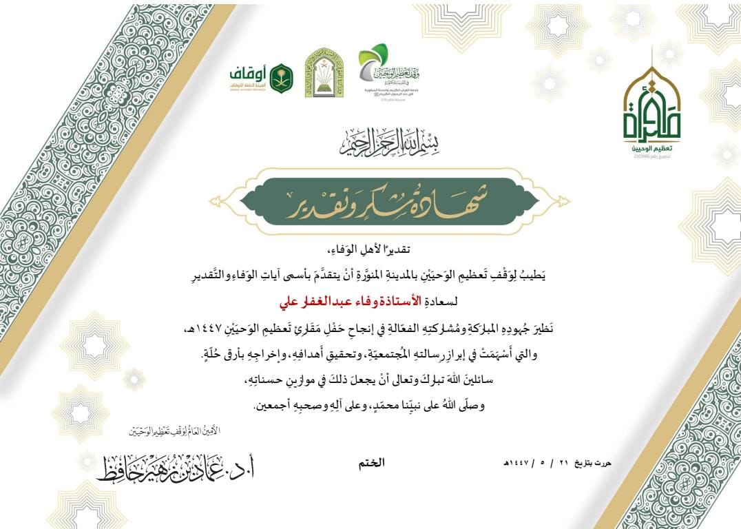 تكريم جريدة موطني الدولية من وقف تعظيم الوحيين بالمدينة المنورة مع اطلالة الشهر الكريم متابعة:جريدة موطني الدولية:- “تقديراً لأهل الوفاء، يطيب لوقف تعظيم الوحيين بالمدينة المنورة أن يتقدم بأسمى آيات الوفاء والتقدير لجريدة موطني الدولية نظير جهود الجريدة المباركة ومشاركتها الفعالة في إنجاح مقرأة تعظيم الوحيين 1447هـ، والتي أسهمت في