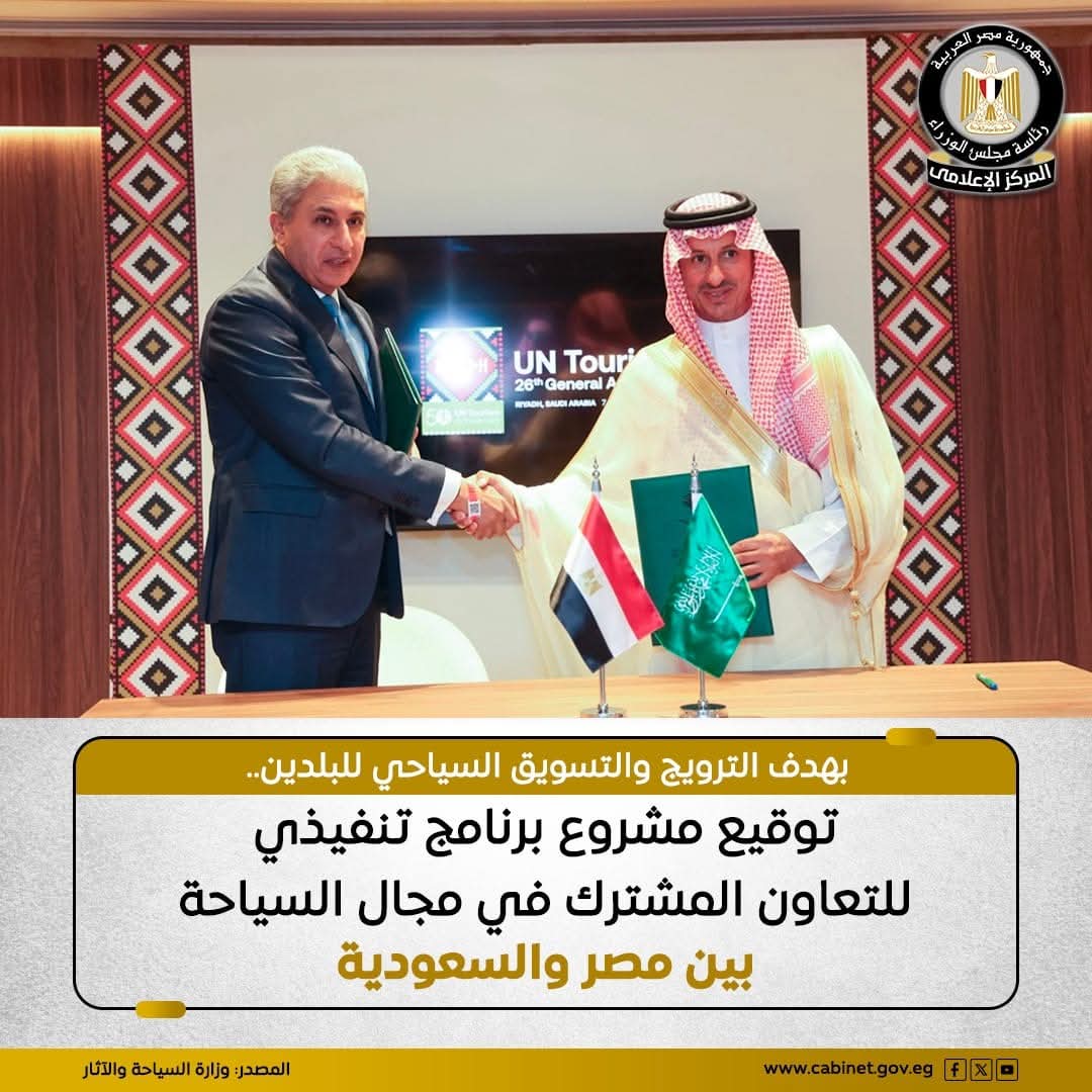 تم توقيع مشروع البرنامج التنفيذي بين وزارة السياحة والآثار المصرية ووزارة السياحة السعودية. متابعة عبده الشربيني يأتي هذا البرنامج التنفيذي استنادًا إلى مذكرة التفاهم الموقعة بين الجانبين في نوفمبر 2014 للتعاون في مجال السياحة. يتناول هذا البرنامج التعاون في العديد من المجالات من بينها الترويج والتنشيط والتسويق السياحي المشترك، والتأهيل
