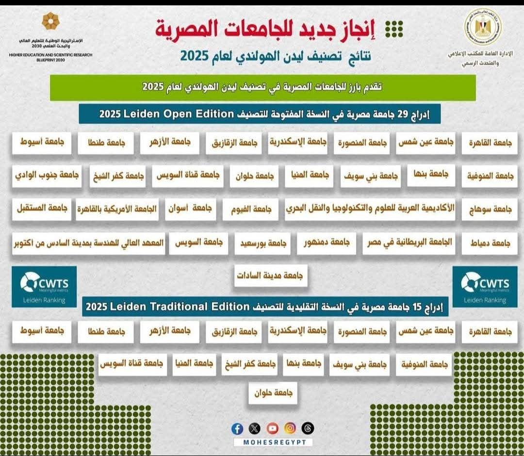 الرئيسية ⁄ جامعة حلوان تُدرج ضمن تصنيف ليدن الهولندي لعام 2025 في النسختين التقليدية والمفتوحة