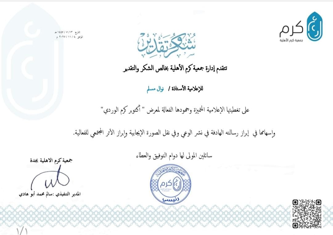 الرئيسية ⁄ جمعية كرم الاهلية الخيرية تكرم الأستاذة نوال مسلم من جريدة موطني الدولية