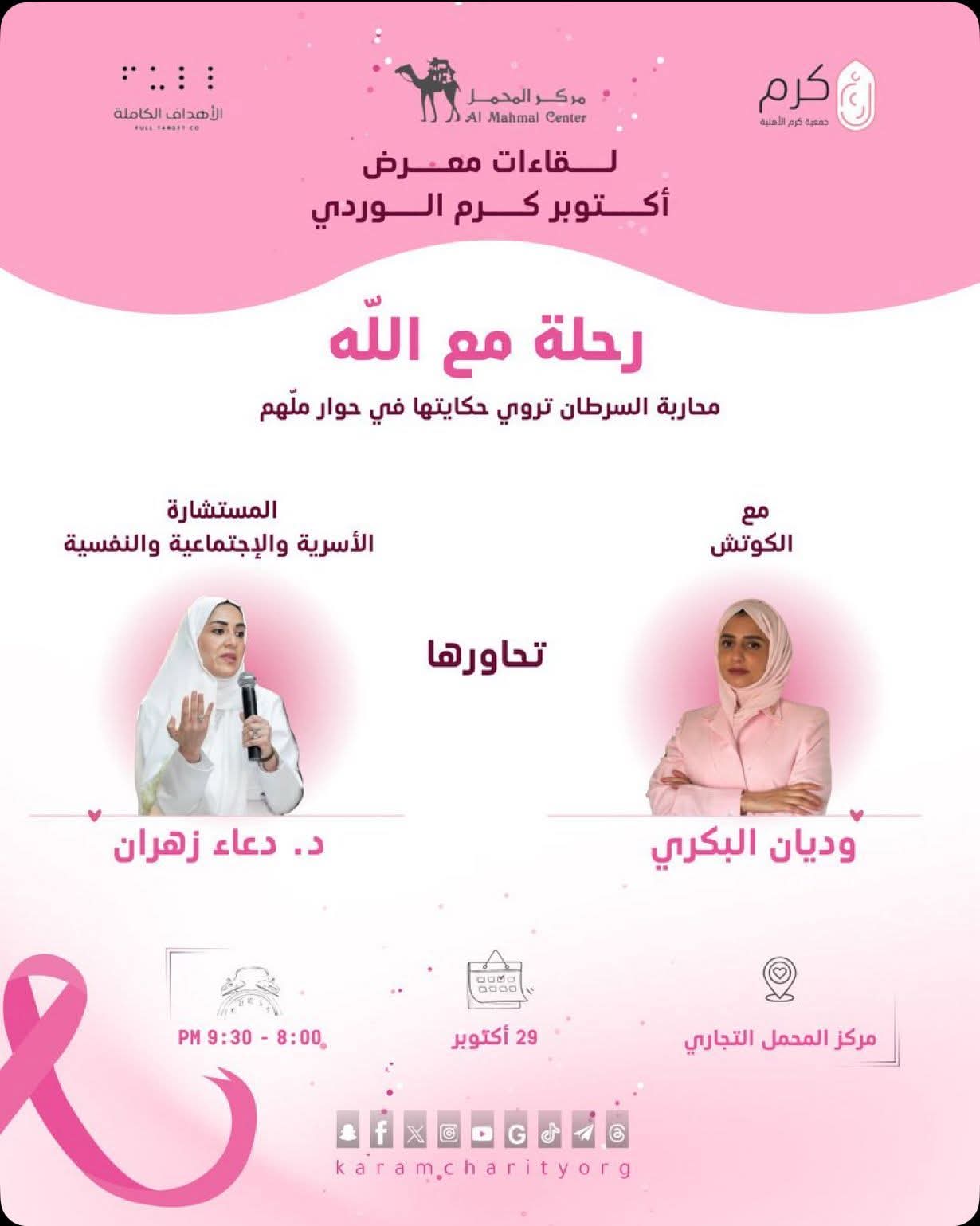 جمعية كرم بجدة تقيم لقاء مساء بعد غد الأربعاء بعنوان ( رحلة مع الله) نوال مسلم :جدة :- ضمن الأنشطة والبرامج والفعاليات والمبادرات التي تقوم بها جمعية كرم بجدة تقيم مساء بعد غد الأربعاء التاسع والعشرون من شهر أكتوبر الحالي لقاء بعنوان ( رحلة مع الله) ‏حكاية مُلهمة ترويها محاربة