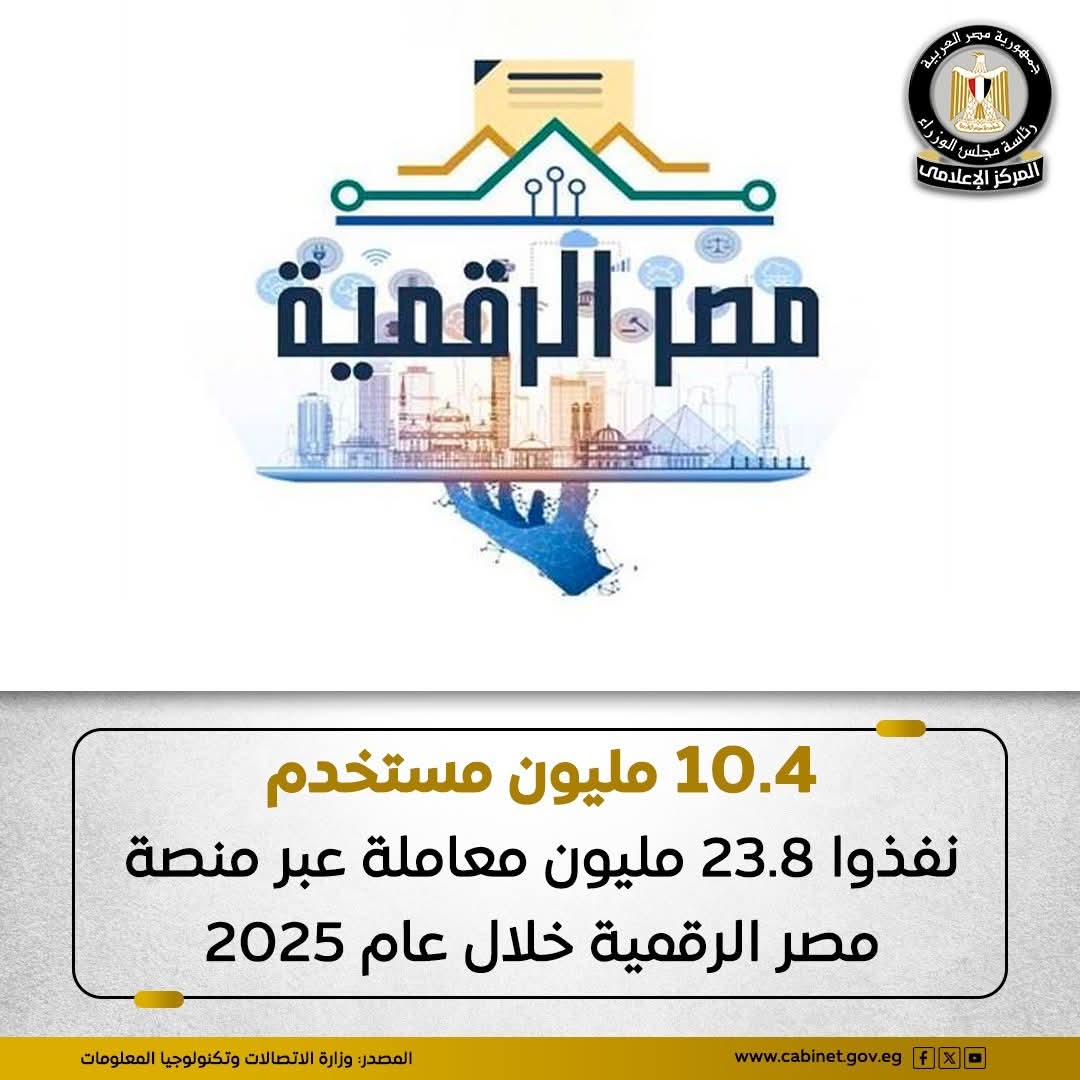 مصر الرقمية" شهدت تطورًا كبيرًا خلال عام 2025، حيث بلغ عدد الخدمات الحكومية أكثر من 200خدمة عبده الشربيني منصة "مصر الرقمية" شهدت تطورًا كبيرًا خلال عام 2025، حيث بلغ عدد الخدمات الحكومية الرقمية المتاحة أكثر من 200 خدمة، وارتفع عدد المستخدمين من 8.1 مليون في 2024 إلى 10.4 مليون مستخدم