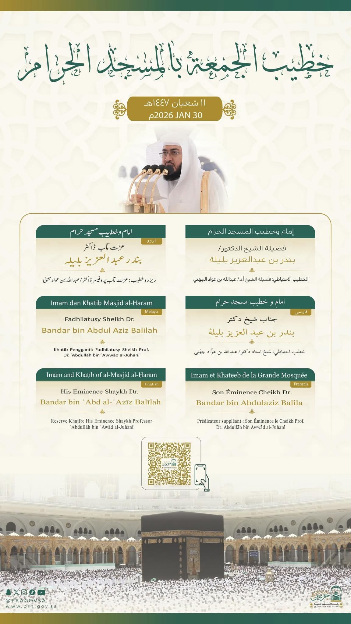 رئاسة الشؤون الدينية تحدد خطيبا الجمعة في الحرمين الشريفين ليوم بعد غد 27 رجب 1447هـ د. منصور نظام الدين مكة المكرمة:-   المستشار الإعلامي لجريدة موطني الدولية    أوضحت رئاسة الشؤون الدينية بالمسجد الحرام والمسجد النبوي، أسماء خطيبا وإماما صلاة الجمعة في الحرمين الشريفين 27 رجب 1447هـ وذلك ضمن جدولها