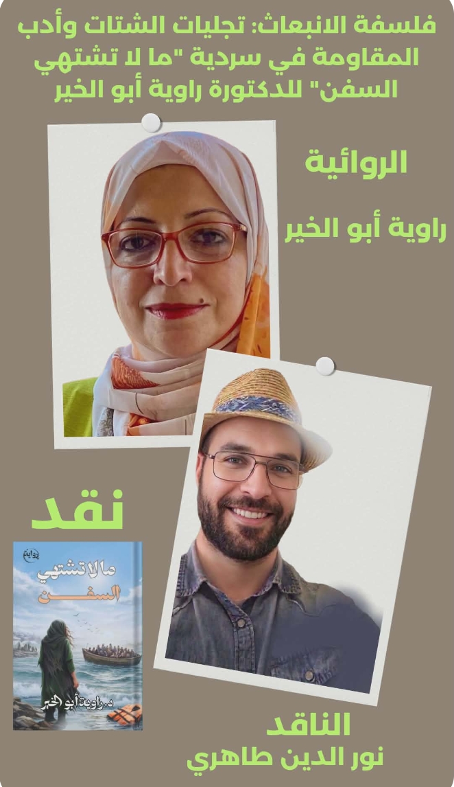 قراءة نقدية فلسفة الانبعاث: تجليات الشتات وأدب المقاومة في سردية "ما لا تشتهي السفن" للدكتورة راوية أبو الخير بقلم الناقد نور الدين طاهري بين مطرقة الحدث الجلل وسندان الذاكرة المتقدة، تنبثق رواية "ما لا تشتهي السفن" للدكتورة راوية أبو الخير؛ لا بوصفها مجرد تدوين لمأساة فيزيائية عابرة،
