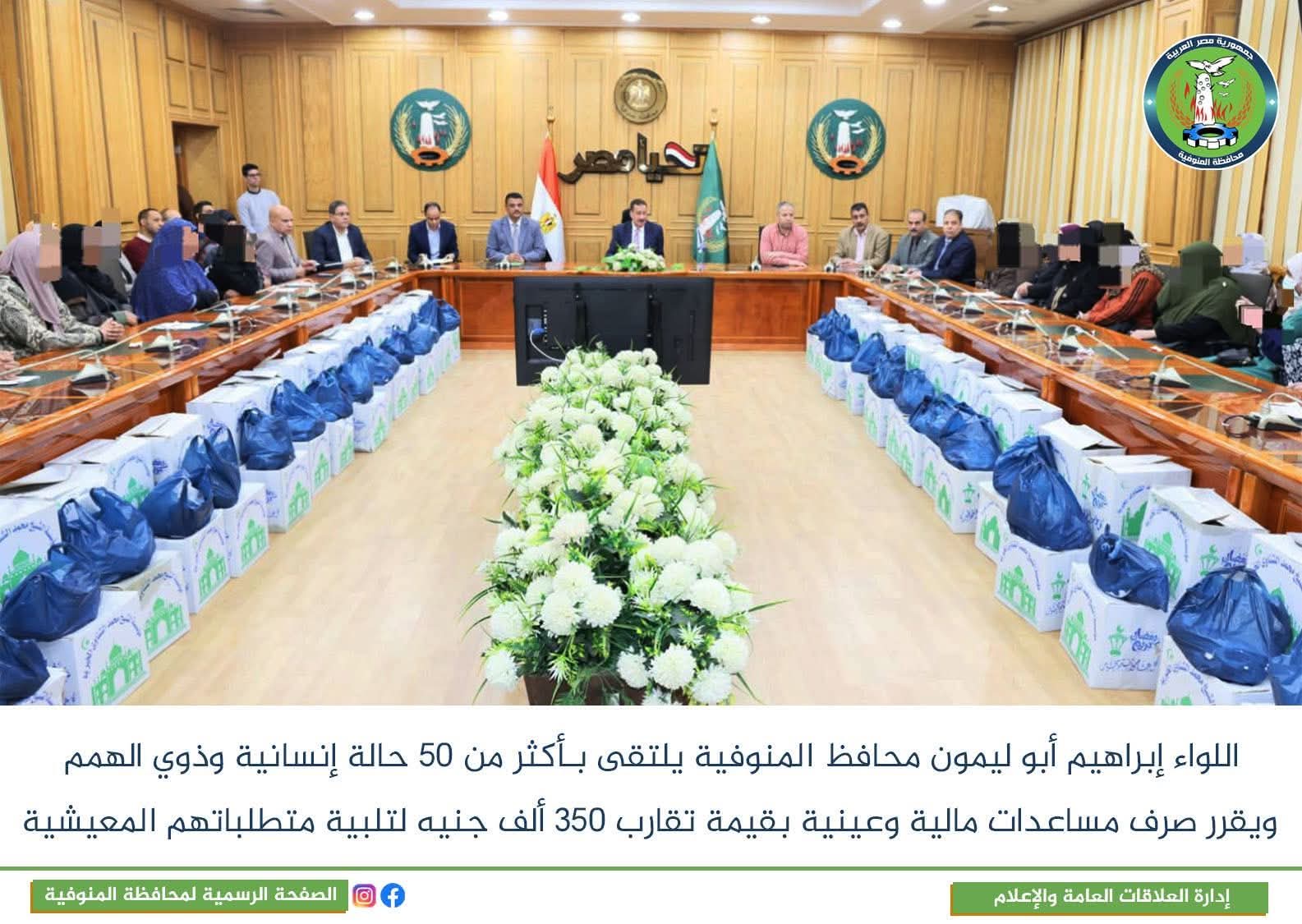 الرئيسية ⁄ محافظ المنوفية يستجيب لـ50 حالة إنسانية ويصرف مساعدات بقيمة 350 ألف جنيه